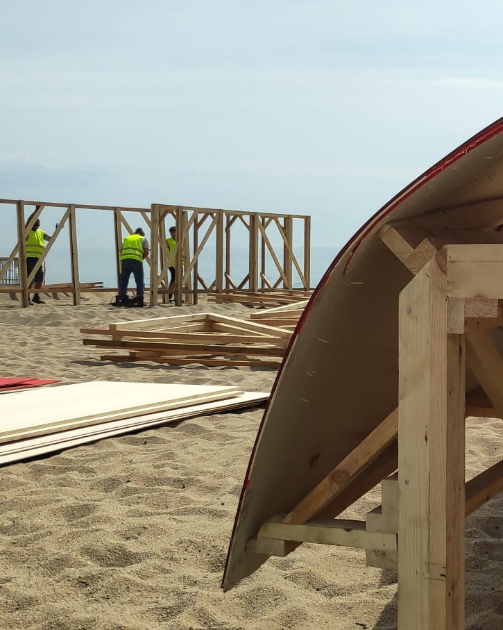 Ramon de los Heros, el seu constructor, parla de peces més petites per facilitar el trasllat des del seu taller a Barcelona fins a la Platja de Badalona. Enguany s'ha canviat el sistema i s'ha planificat una jornada de trasllat i dos de muntatge.