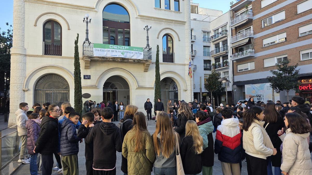 Prop d’uns 150 infants de 4t i 5è de primària de les escoles López Torrejón, Joan Llongueres, Miguel Hernández i Ventós Mir, s’han concentrat aquest matí a la plaça de la Vila amb motiu del Dia Escolar de la no-Violència i la Pau.