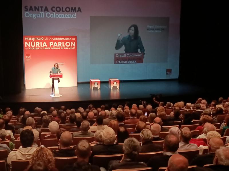 Davant d'un teatre Sagarra ple, amb gairebé 800 persones, Núria Parlon s'ha tornat a presentar aquest dimarts com a candidata del PSC a Santa Coloma, per al que seria el seu cinquè mandat consecutiu. Parlon ha assegurat als veïns de la ciutat que el seu govern serà continuista, i ha reivindicat la feina feta en àmbits tan diversos com l'impuls econòmic, l'urbanisme, la cultura i la transformació del riu Besòs. Parlon ha defensat també l'orgull de ser colomenc, i el caràcter fort que, diu, tenen els veïns de la ciutat.